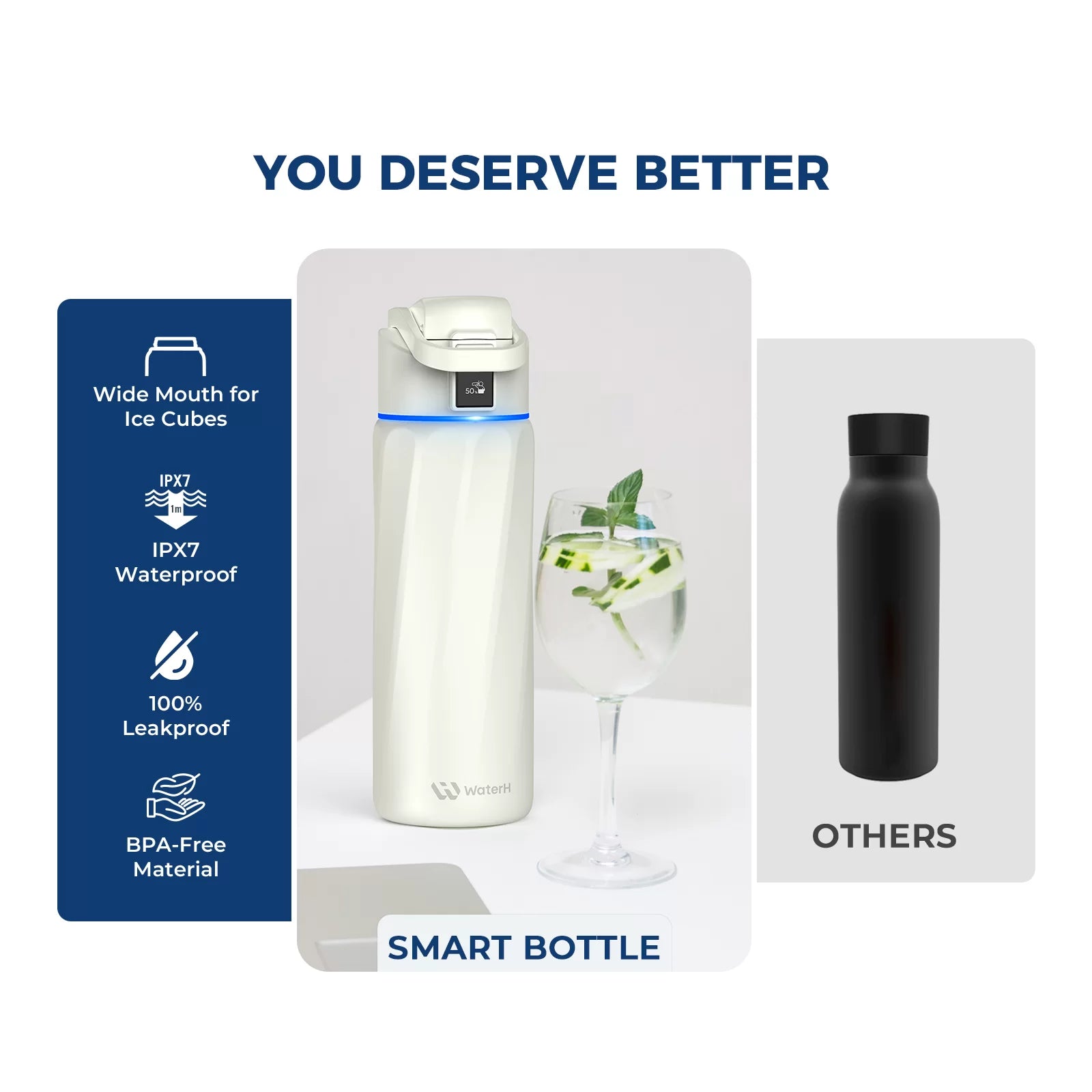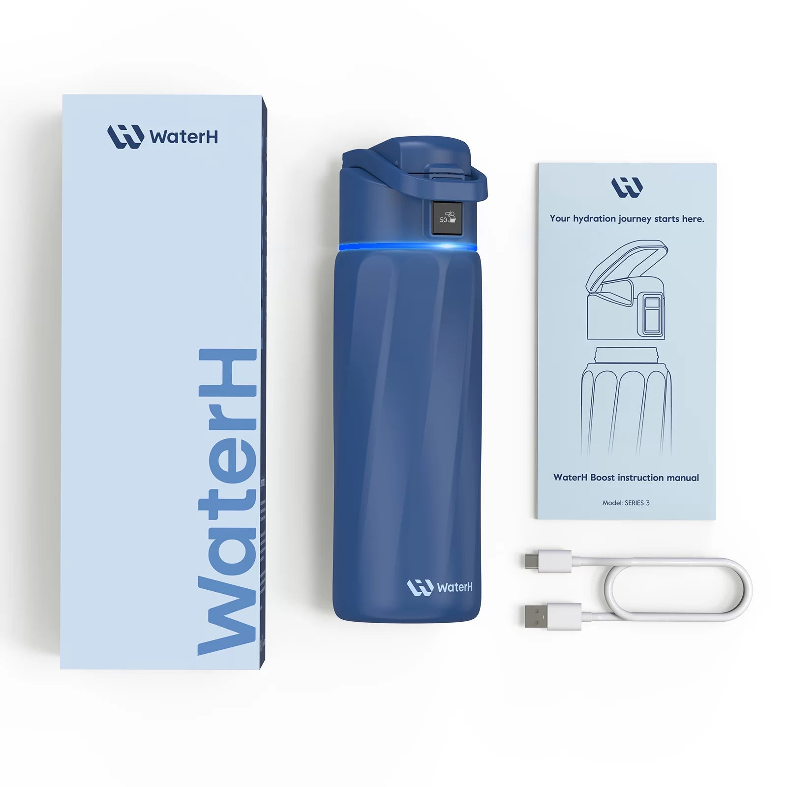 Track daily water intake effortlessly with WaterH's 24oz smart water bottle. Food-grade materials, 30-day battery, iOS/Android compatible. Get hydration reminders & achieve your wellness goals. Free shipping & 30-day returns.